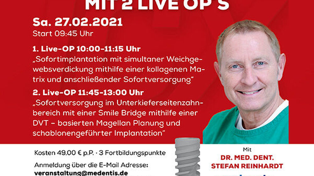 In Zusammenarbeit mit dem Implantatzentrum Münster präsentiert medentis medical am 27. Februar 2021 ab 09:45 Uhr zwei Live-OPs mit Dr. Stefan Reinhardt.