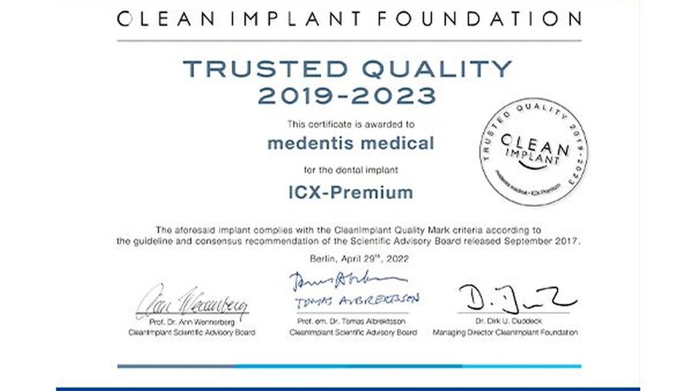 Erfolgreiche Re-Zertifizierung des ICX-PREMIUM Implantats durch die CleanImplant Foundation CIF GmbH.