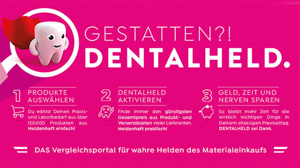 Seit November 2018 steht DENTALHELD für das Vergleichsportal mit Helden-Faktor. Getreu dem Motto „Alles auf einen Klick“ bietet DENTALHELD Zahnarztpraxen und Zahntechniklaboren deutschlandweit ein umfassendes Sortiment bestehend aus über 120.000 Produkten verschiedener Lieferanten und ermöglicht bis zu 40 Prozent beim Einkauf zu sparen. Denn DENTALHELD findet immer den günstigsten Gesamtpreis aus Produkt- und Versandkosten im direkten Vergleich – Dank einer vollautomatischen Warenkorbanpassung. Damit ist DENTALHELD einmalig unter den Vergleichsportalen für Zahnarztmaterialien. Heldenhaft. Einfach. Sparen. Gestatten?! DENTALHELD – Das Vergleichsportal für Zahnarztmaterialien |