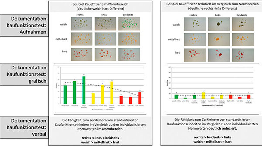 Für einen Kaufunktionstest gibt man dem Patienten etwas zum Kauen: Bei uns sind das Kaufunktionsteile auf Basis von Fruchtgummi. Anhand von standardisierten Fotografien werden Anzahl und Größe der Teile bestimmt. Wichtig ist es, das Ergebnis des Kaufunktionstests in verständlicher Form darzustellen, sodass der Patient direkt sehen und nachvollziehen kann, dass er für eine normale Kaufunktion eine gewisse Anzahl an Einzelteilen in einer festgelegten Zeit produzieren muss.
