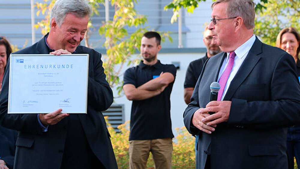 Zu diesen Anlässen gratulierten IHK-Hauptgeschäftsführer Burghard Loewe und Gemeinde-Bürgermeister Götz Konrad. „Wie ein Familienfest“, so beschrieben sie die Atmosphäre an diesem Abend. Mit Stolz präsentierte Kettenbach-Geschäftsführer Jens Kuhn die überreichte Ehrenurkunde zum Jubiläum. Er wolle keine langen Reden halten, sei aber stolz auf seine Mitarbeiter und das Erreichte. „Wir wollen von Marktchancen profitieren und weiter wachsen“, sagte Kuhn.