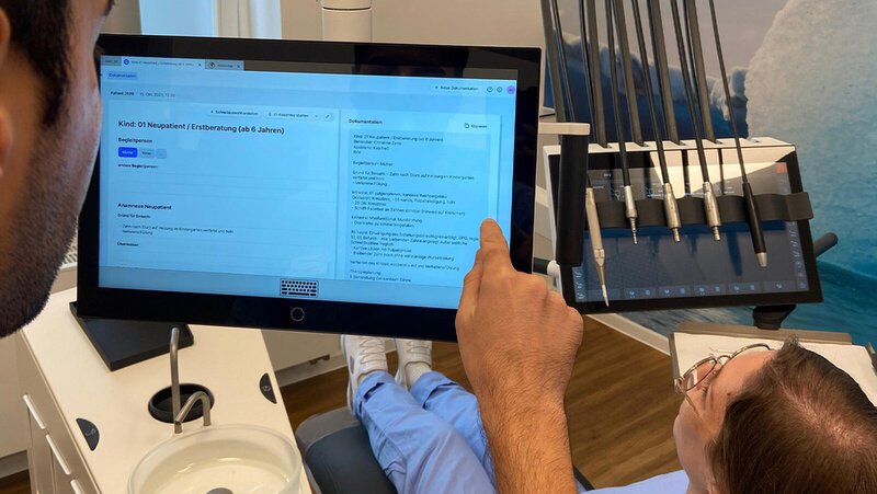 Weil KI-Assistenz und unser Verwaltungsprogramm cloudbasiert arbeiten, lässt sich alles bequem über den Touchscreen von unserer Behandlungseinheit bedienen. Der Übertrag zwischen den Programmen funktioniert auf Knopfdruck. Das Mikrofon zur Tonaufnahme lässt sich ebenfalls direkt an der Einheit verbinden. Alles ist nah dran und schnell zur Hand. Das ist praktisch und ermöglicht uns, bei fehlendem Personal ohne viel Nacharbeit allein zu behandeln. Patienten müssen wir seitdem nicht mehr abbestellen. Das hat unsere Honorarausfälle reduziert.