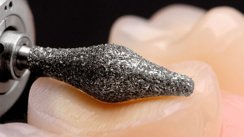 den 855D: ein Präparationsdiamant mit Tiefenmarkierung, mit dem im ersten Schritt kontrolliert die geplante okklusale Eindringtiefe markiert und die okklusale Kaufläche 1 mm tief eingeebnet wird.