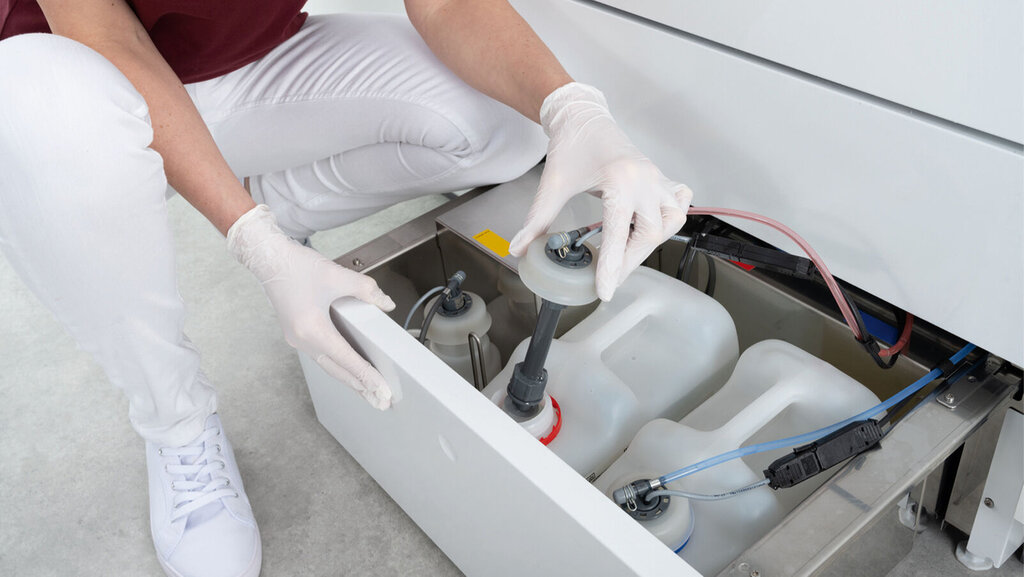 Eine integrierte Push2Open-Schublade unterhalb der Kammer bietet Platz für zwei 5-Liter-Kanister und 1 Flasche Prozesschemikalien. So sind alle Behälter bei Bedarf leicht entnehm- und austauschbar. Eine integrierte Auffangwanne und ein Halterahmen für die Sauglanzen sorgen für sauberes und wirtschaftliches Arbeiten – mit effizienter Restentleerung und weniger Chemikalienverlust.