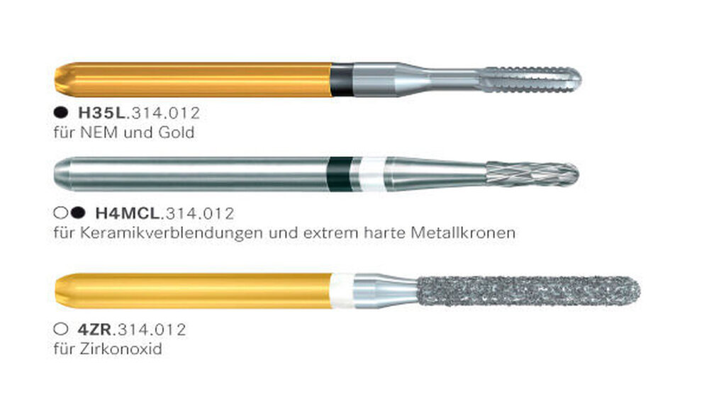 H35L:Er ist der optimierte Nachfolger des H34L, der speziell für NEM- und Goldkronen entwickelt wurde. Im Vergleich zu seinem Vorgänger konnten Schneidleistung und Standzeit optimiert werden.