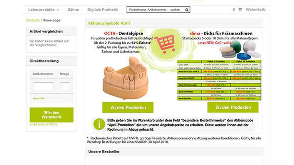 Über den neuen Webshop können Kunden die klassischen Laborprodukte beziehen – aktuell die Produktlinien Hera, HeraCeram, dima, Pala und Signum. Eines der Highlights des neuen Webshops ist die intelligente Suchfunktion: Wenn Kunden den Produktnamen in dem Feld „Suche“ auf der Startseite eingeben, wird ihr Wunschartikel bereits nach der Eingabe weniger Buchstaben vorgeschlagen. Aber nicht nur nach Produktnamen, sondern auch über Artikelnummern und Schlagworte sind Produkte sehr rasch auffindbar.