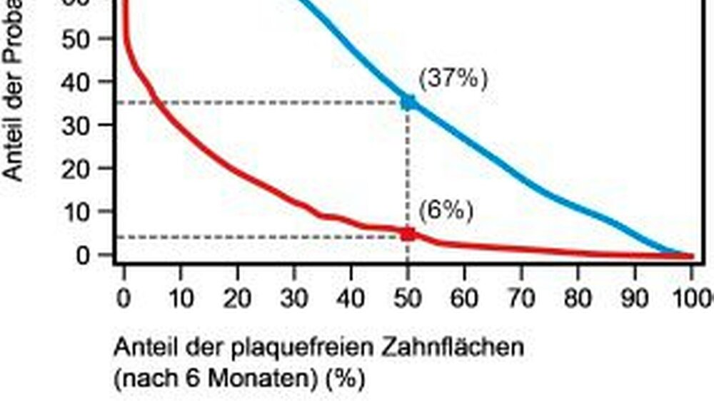 Nach sechs Monaten wurde erhoben, bei wie viel Prozent der Teilnehmer die Hälfte der Zahnflächen frei von Plaque war: Dies traf für 37% der Teilnehmer der EOMM-Gruppe zu (vgl. Abbildung 1). In der MM-Gruppe wurde Selbiges lediglich bei 6% der Probanden beobachtet (Odds Ratio=7,8; 95% CI: 5,4-11,2). Somit ermöglicht die zweimal tägliche zusätzliche Verwendung einer Mundspülung mit ätherischen Ölen eine 7-mal höhere Chance, die Zahnflächen von Plaque zu befreien, als die mechanische Zahnreinigung allein.