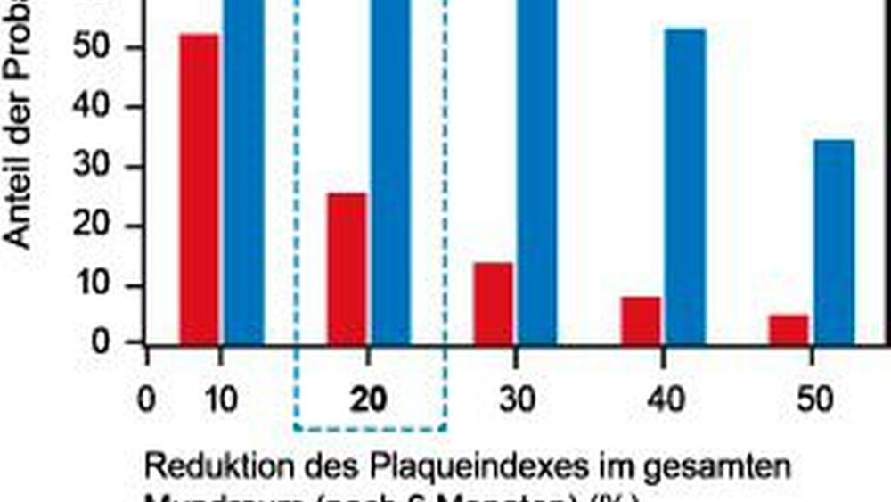 Zudem wurde nach sechs Monaten die Veränderung des Plaqueindexes ermittelt: Bei 83% der Teilnehmer, die zusätzlich zweimal täglich spülten, verringerte sich der Plaqueindex signifikant um 20% (vgl. Abbildung 2). In der Gruppe der Probanden, die nur mechanisch reinigten, konnte hingegen eine Verringerung des Plaqueindexes um 20% nur bei einem Viertel der Teilnehmer festgestellt werden. Insgesamt konnte bei Probanden der EOMM-Gruppe nach sechsmonatiger zusätzlicher Anwendung der Mundspülung eine um 28% stärkere Plaquereduktion beobachtet werden als bei den Probanden, die ihren Mundraum lediglich mechanisch reinigten.