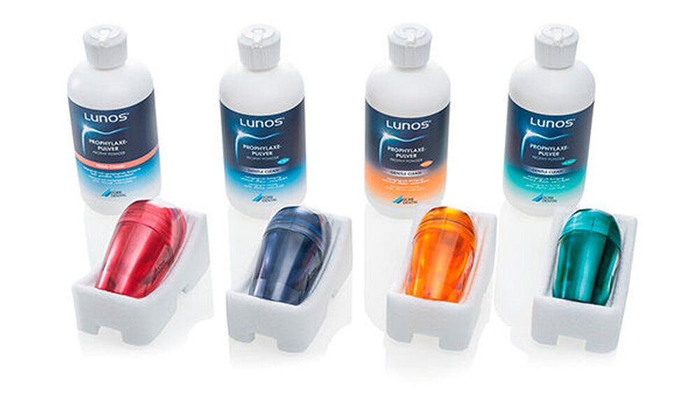 Die Pulverkammern gibt es in vier verschiedenen Farben, die für die entsprechenden Prophylaxepulver von Lunos stehen: Blau für Gentle Clean Neutral, orange für die Geschmacksrichtung Orange, grün für Spearmint und der rote Behälter steht für das Prophylaxepulver Perio Combi. So ist auf den ersten Blick ersichtlich, welche Kammer welches Pulver enthält.