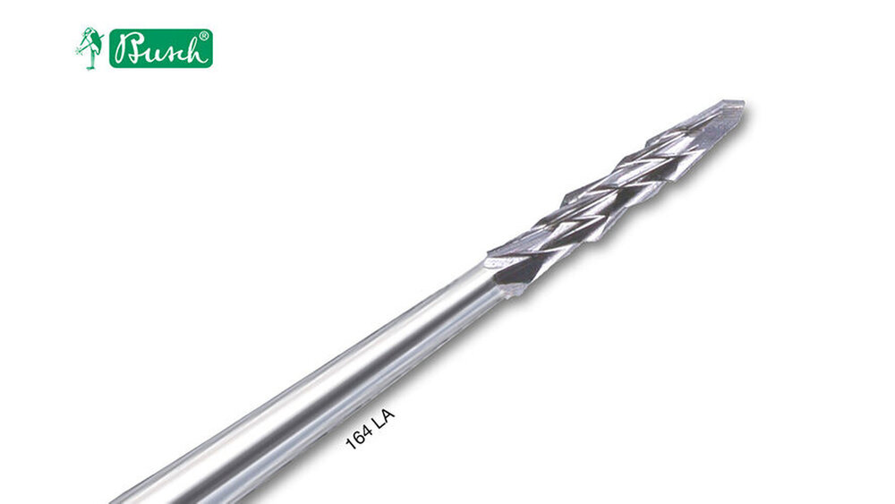 Die spezielle Konstruktion des neuen Knochenfräsers 164LA mit seinem kleinen Arbeitsteil (ISO-Größe 012) in Kombination mit dem langen schlanken Hals zeichnet dieses sehr filigrane Instrument aus. So wird feineres Arbeiten an Knochengewebe und auch Zahnhartsubstanz mit mehr Übersicht selbst bei tiefer liegenden Operationsgebieten ermöglicht. Die bewährte A-Verzahnung sorgt für die schonende Zerspanung und feinere Oberflächen.
