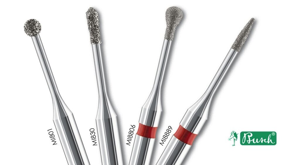 BUSCH hat für diese Anforderungen minimalinvasive Diamantschleifer im Sortiment, die sich durch lange schlanke Hälse und kleinste Arbeitsteil-durchmesser auszeichnen.