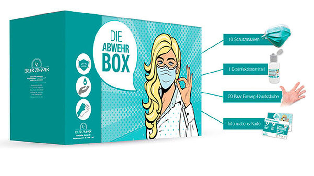 Die „Abwehr-Box“ bietet der zahnärztlichen Praxis wichtige Hilfsmittel, um sowohl Patienten als auch das gesamte Praxisteam vor einer Infektion zu schützen. In der Box enthalten sind 10 Mund-Nasen-Schutzmasken, ein Desinfektionsgel (125 ml) und 50 Paar Einweghandschuhe.