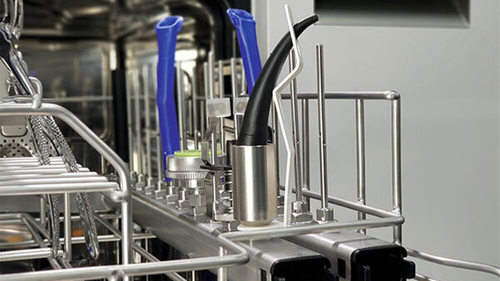 Wo Angstpatienten mit Lachgas behandelt werden, stellt die Aufbereitung der wiederverwendbaren Doppelschläuche und Masken eine zusätzliche Herausforderung dar. Miele bietet dafür ab Anfang 2022 eine platzsparende Lösung an: Eine neue Halterung, in der bis zu zwei Schläuche Platz finden, und deren Kapazität auf insgesamt fünf erhöht werden kann. Die Schläuche werden über Adapter an Injektordüsen angeschlossen und an allen anderen Einsätzen in einer leicht geneigten Halterung vorbeigeführt. Somit ist eine zuverlässige Innen- und Außenreinigung sowie Trocknung gesichert. Für aufbereitbare Patientenmasken steht eine passende Siebschale zur Verfügung. Darüber hinaus bleibt genügend Kapazität für Hohlkörper und weiteres Instrumentarium innerhalb derselben Charge, sodass der gewohnte Ablauf des Aufbereitungsprozesses nicht gestört wird.