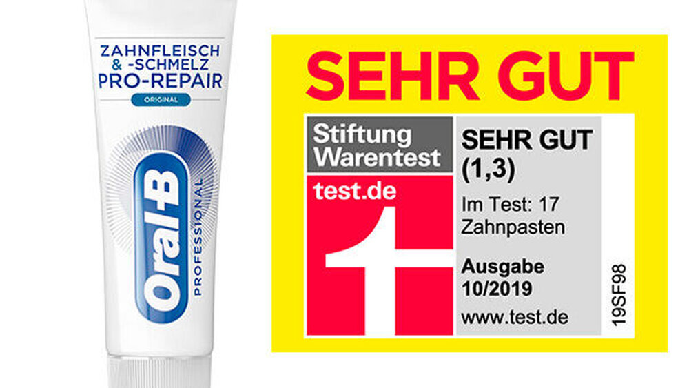 Die Oral-B Zahnfleisch & -schmelz PRO-REPAIR Original ist von Stiftung Warentest als „SEHR GUT“ (1,3) bewertet worden. Stiftung Warentest hat im aktuellen Testlauf 10/2019 17 Zahncremes geprüft.