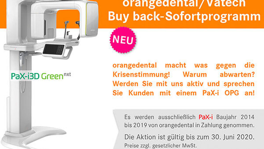 Das Buy back-Sofortprogramm ist gültig bis zum 30. Juni 2020. Detaillierte Informationen zu den Bedingungen des Buy back-Sofortprogramms 2020 erhalten Interessierte über den Dentalfachhandel oder direkt bei orangedental.