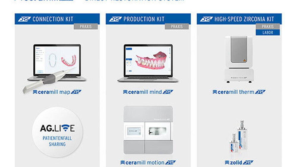 AG.Live bildet auch die Grundlage und Schnittstelle für das Ceramill Direct Restoration System (DRS), mit dem Amann Girrbach den digitalen Ceramill CAD/CAM Workflow zum Zahnarzt hin erweitert. Als Einstiegsvariante dient das Ceramill DRS Connection Kit, bestehend aus dem Intraoralscanner Ceramill Map DRS, zugehöriger Scansoftware sowie der Anbindung an die AG.Live Plattform. Jegliche Auftragsdaten inkl. aller benötigten Informationen können somit nahtlos und in Echtzeit geteilt werden, denn die Praxis wird via AG.Live volldigital an das Labor angebunden. Somit wird auch Same Day Dentistry für simple Restaurationen ermöglicht, mit dem Ceramill DRS High-Speed Zirconia Kit auch mit Zirkonoxid.