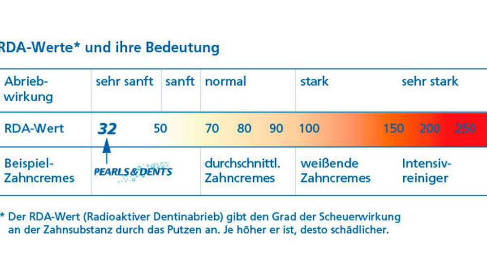 Quelle:[1]RDA-Wert (32) gemessen nach Messmethode „Züricher Modell“ (2014).[2]E. Kramer, „Das Konzept einer Amin- und Natriumfluorid enthaltenden Zahnpasta“, Pharmazeut Rundschau 8/1995
