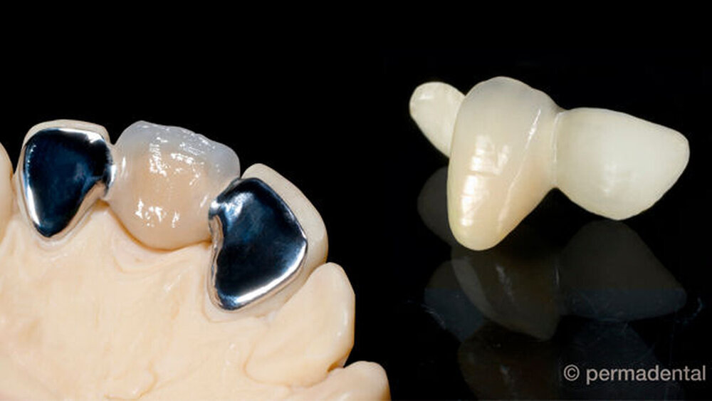 Permadental bietet in seiner breiten Produktpalette alle Alternativen an, die bei Adhäsivbrücken eine Rolle spielen: Ein- oder zweiflügelig, NEM vollverblendet oder verblendetes Zirkon. Ernesti sagt: „Zwar ist der Anwendungsbereich für die Marylandbrücke nicht allzu groß, aber bei entsprechender präziser Ausführung und guter Mundhygiene des Patienten kann Sie eine gute Alternative zum Einzelimplantat sein“.