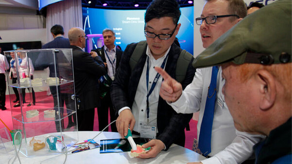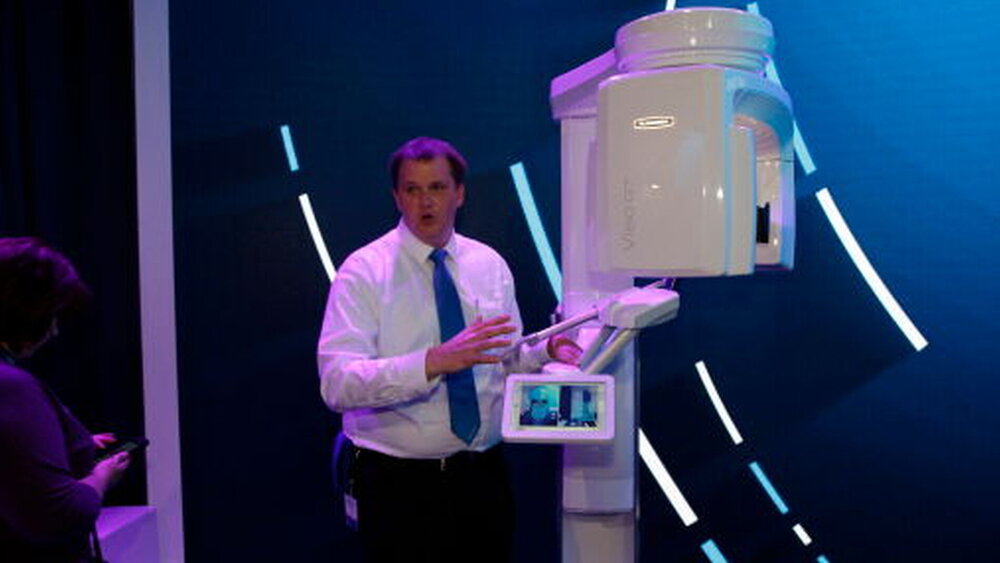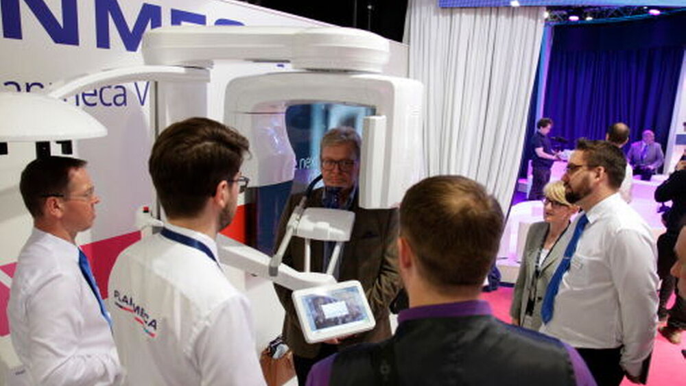Bei einem Rundgang über den Stand von Planmeca stellt Sales Manager Patrick Jörg die Innovationen der finnischen Medizintechnik Firma vor. Das sind vor allem das neue Röntgengerät Planmeca Viso für digitalen Volumentomografie, der iterative Planmeca CALM-Algorithmus zur Korrektur von Patientenbewegungen und der kompakte und extrem leichte Intraoralscanner Planmeca Emerald.