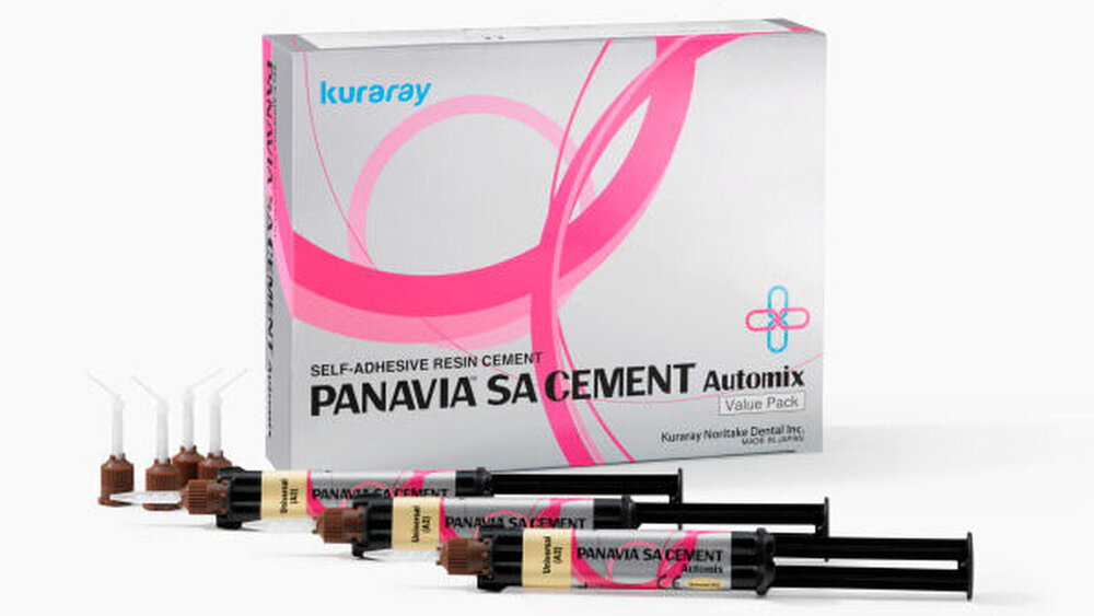 Panavia SA Cement Automix ist ein selbstadhäsiver Befestigungszement im Automix-System mit dualhärtenden Eigenschaften und bietet sich insbesondere für die einfache Befestigung ohne Ätzen oder Vorbehandlung der Zahnoberfläche an. Dank des MDP Monomer zeichnet sichdas Material durch eine besonders hohe Haftkraft aus. Dies gilt sowohl für Schmelz und Dentin als auch für Metalloxid-Keramik (Zirkonoxid oder Aluminiumoxid) und Metall. Das Präparat kann direkt aus der Automix-Spritze in die Restauration eingebracht werden und erfordert keinen weiteren „Kapselmischer“.