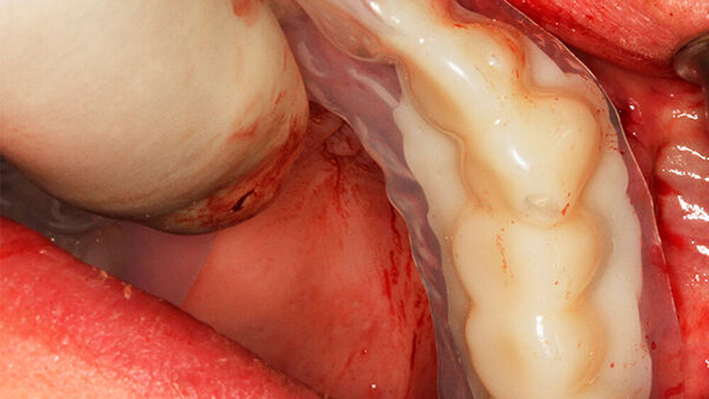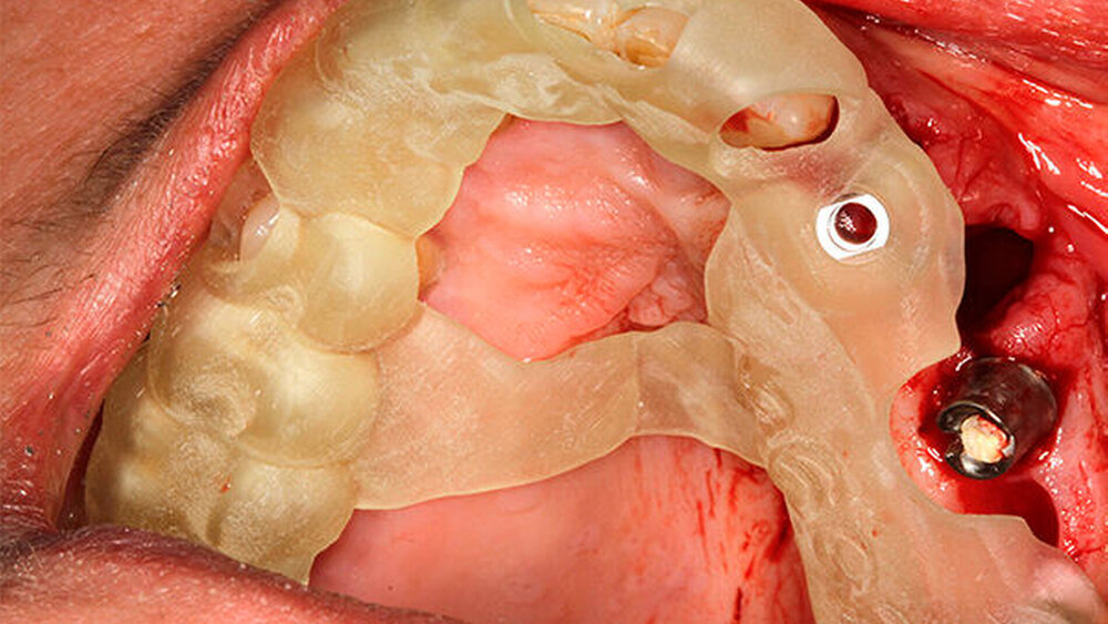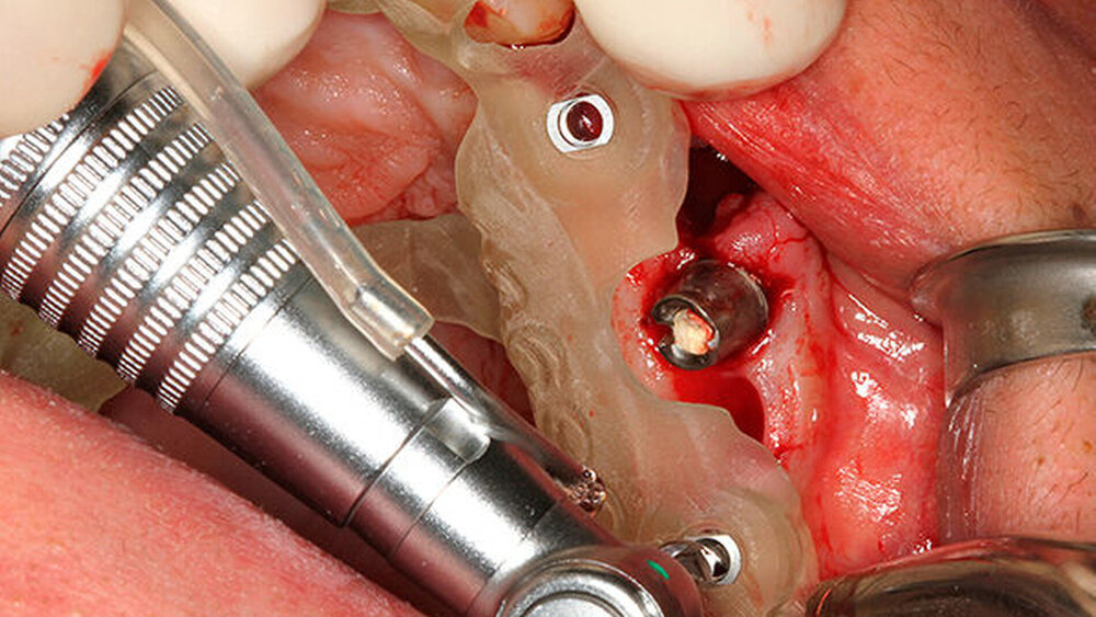 Ich setze in meiner Praxis 90 Prozent aller Implantate schablonengeführt. Im ästhetischen Bereich halte ich das auch für zwingend notwendig, gerade bei der Sofortimplantationen. Denn nach der Extraktion hilft mir das enorm, die erste Bohrung zu setzen, und verhindert ein Abrutschen im alten Alveolenfach.