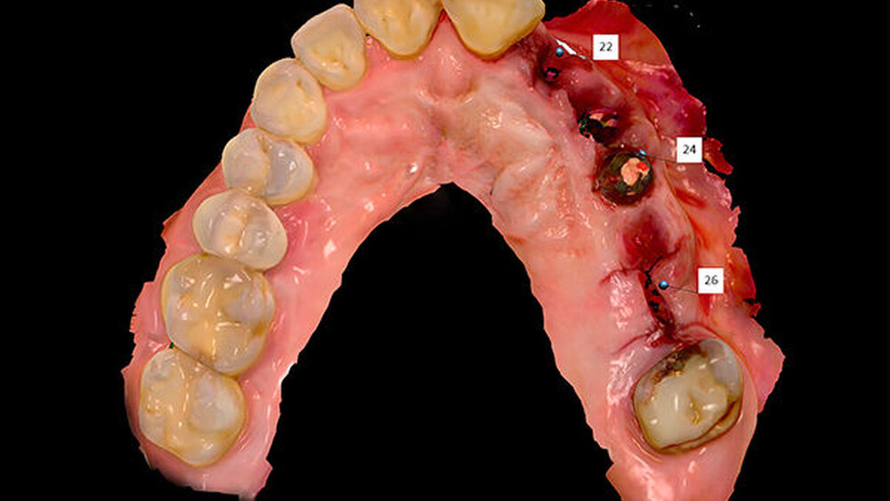 Wir haben extrahiert, dann die Implantate inseriert, direkt nach der Implantation die Scanbodys aufgesetzt, den optischen Abdruck genommen und das Langzeitprovisorium aus PMMA verschraubt. Dass die Innenverbindung immer die gleiche ist, hilft dabei sehr. Eine Prothetik passt tatsächlich auf alle Implantate.