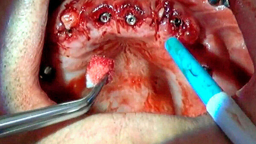 Nach der Implantation füllte der Zahnmediziner alle Alveolen mit Knochenersatzmaterial (Bio-Oss Collagen Block) auf, um den Kieferkamm zu halten und Knocheneinbrüche zu vermeiden. Anschließend erfolgte das Einsetzen und Verkleben des Provisoriums. Otte bestrich den Kunststoff der ICX SmileBridge innen mit etwas Bonding bzw. Monomer, um ihn anzusäuern und einen guten Verbund sicherzustellen. Die Implantatpfosten wurden mit Monobond Plus benetzt, um einen sicheren Verbund zwischen Metall und Kunststoff zu erhalten. Anschließend wurde der Kunststoff gebondet (Scotchbond) und die SmileBridge eingepasst. Die Überarbeitung und das endgültige Polieren der SmileBridge erfolgten im Labor.