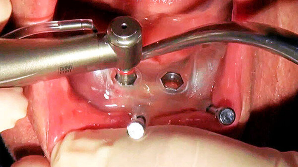 Nach der Extraktion der Teleskopzähne fixierte Gerritz die Bohrschablone mit zwei Befestigungspins und entfernte das Weichgewebe mithilfe von zwei an die jeweilige Implantatgröße angepassten Gingivastanzen (ICX-Magellan Gingiva-stanze rot, Durchmesser 3,75 Millimeter, und ICX-Magellan Gingivastanze grün, Durchmesser 4,1 Millimeter). Die Bohrsequenz begann der Experte mit dem ICX-Magellan Vorbohrer, der für alle vier zu setzenden Implantate gleich war. Die Aufbereitung erfolgte graduell, da im Unterkiefer in Regio 42 und 32 nach vorherigem Röntgenbefund harter Knochen der Qualität D2 bzw. D3 zu erwarten war (ICX-Magellan D2-3-Bohrer rot Durchmesser 3,75 Millimeter). Nach der final vorgeschriebenen Bohrung mit dem ICX-Magellan Stop-Bohrer konnten die beiden ICX-Premium-Implantate mit dem Durchmesser 3,75 Millimeter in Regio 42 und 32 eingebracht werden. Im Anschluss erfolgte die Insertion der beiden ICX-Premium Implantate (grün, 4,1 Millimeter Durchmesser) in Regio 45 und 36. Da sich der Knochen im Seitenzahnbereich als deutlich weicher erwies, nutzte Gerritz einen größeren Vorbohrer, dann den ICX-Magellan D2-3-Bohrer (grün, Durchmesser 4,1 Millimeter) und abschließend den Stop-Bohrer (grün, Durchmesser 4,1 Millimeter). Sofortversorgungen erfordern eine besonders hohe Primärstabilität, um Relativbewegungen zu vermeiden. Das terminale Drehmoment bei der Fixierung des Implantats am Ende des Insertionsvorgangs sollte Gerritz zufolge daher idealerweise 35 bis 40 Ncm betragen.