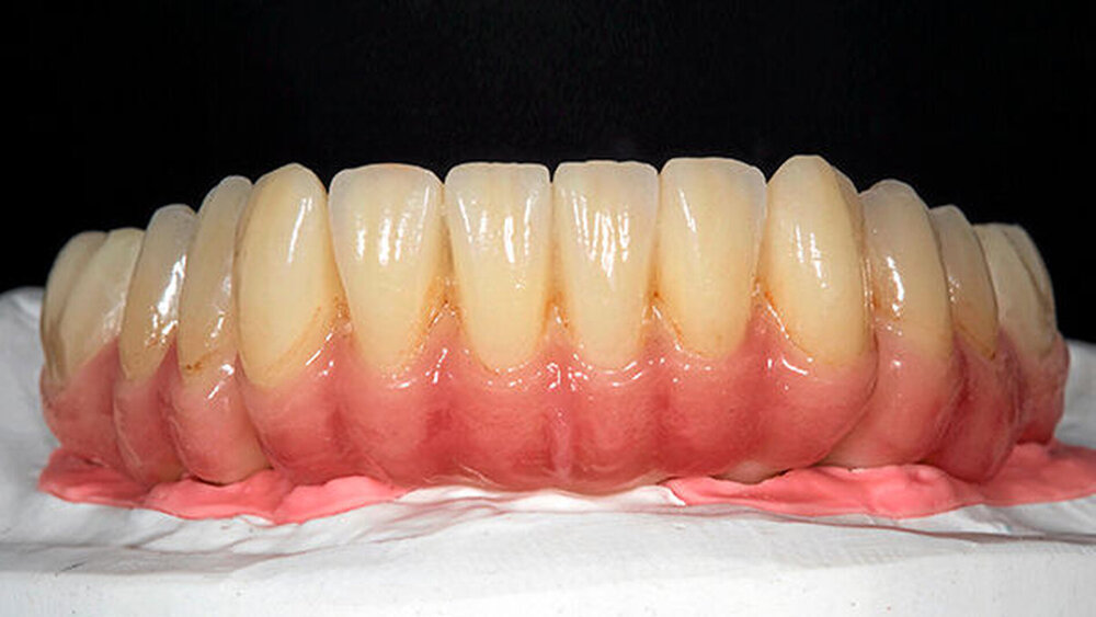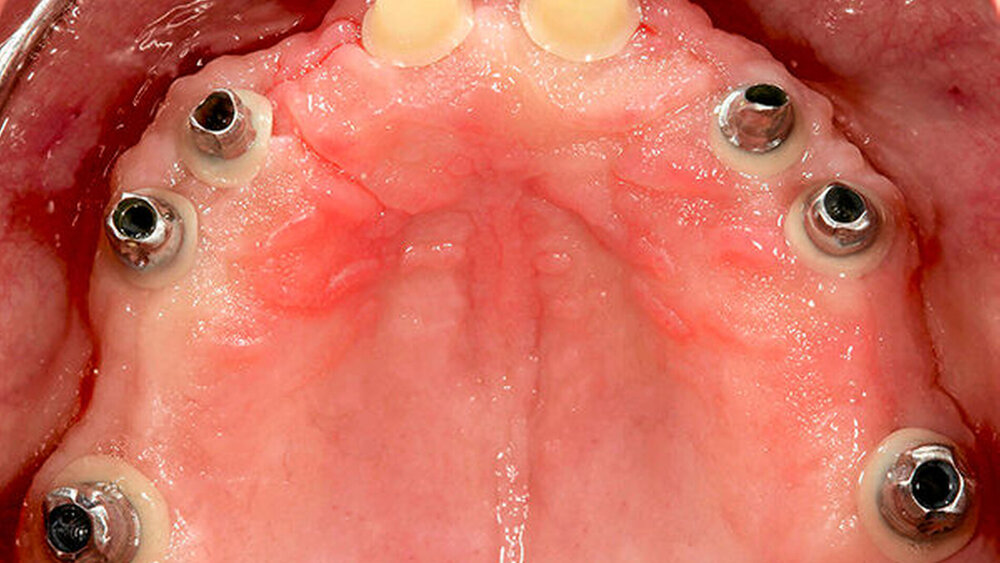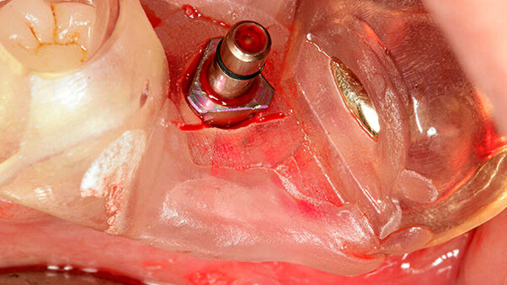 Die größte Herausforderung dabei, trotz 3D-Planung und Bohrschablone, ist es, die rote Ästhetik im Frontzahnbereich zwei bis drei Monate nach der Freilegung vorhersagbar zu kalkulieren. Da spielen viele Einflussfaktoren eine Rolle, eine zu dünne vestibuläre Knochenlamelle, der Stressfaktor „axiale Bewegung“, der diese dünne Knochenlamelle schnell überfordern kann etc. Zieht sich das rosafarbene Volumen zurück, ist das natürlich für den Zahntechniker schwierig zu handeln. Eine rosafarbene Gingivakappe, die aus Keramik aufgebrannt wird, kann helfen. Das ist zwar ein Kompromiss, aber ein Kompromiss, mit dem die Patienten leben können.