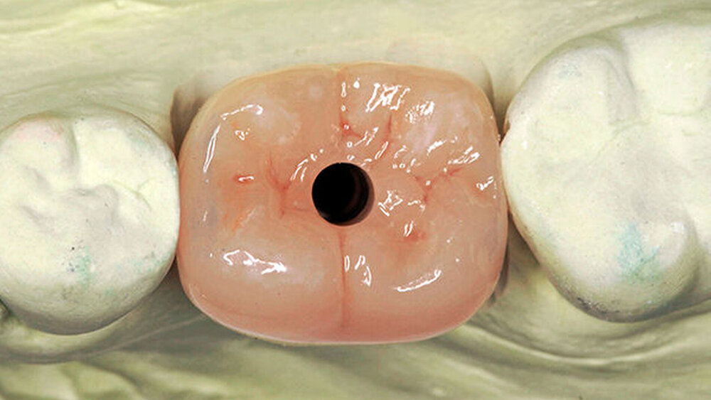 Definitiv. Bis kurz vor der Herstellung der Restauration kann ich entscheiden, ob ich das Abutment einteilig als Hybridkrone oder zweiteilig gestalte. Zudem ist ein Materialmix möglich: Aus Zirkonoxid plus Kunststoff lassen sich Langzeitprovisorien fertigen, das individuelle Kompositabutment kann man nach drei Monaten austauschen, um die Gingiva auszuformen. Oder man bleibt bei Lithiumdisilikat und setzt auf einteilige Hybridkronen.
