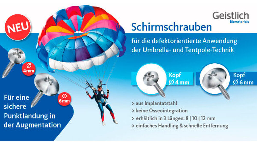 Im defektorientierten Geistlich-Konzept zwischen der GBR (Guided Bone Regeneration) und CBR (Customized Bone Regeneration) eingeordnet, finden die Schirmschrauben im flachen Schraubenkopfdesign im Rahmen der klassischen Tentpole- und Umbrella-Technik ihren Einsatz.