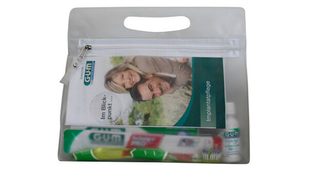 Zur Zahnzwischenraumreinigung enthält das Kit neben Interdentalbürsten auch metallfreie Interdentalraumreiniger sowie eine flauschige Zahnseide mit Einfädelhilfe. Die ebenfalls enthaltene Broschüre „Implantatpflege“ informiert den Patienten umfassend darüber, welche Vorteile Implantate haben und wie er das Implantat am besten pflegt. In der Broschüre wird auch darauf hingewiesen, dass nur die Kombination von häuslicher und professioneller Implantat- und Zahnreinigung ein langes Implantat-Leben sichert.