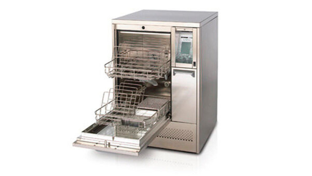 Einzigartig ist der Glaseinsatz in der Türe des HYDRIMM2, durch den der Prozess in der Maschine einsehbar und eine optische Kontrolle der Dreharme möglich ist. Das Fach für die patentierte Reinigungslösung ist platzsparend seitlich im Gerät integriert, so dass kein Kanister extra platziert werden muss. Der eingebaute Touchscreen ermöglicht eine einfache Bedienung des Thermodesinfektors.