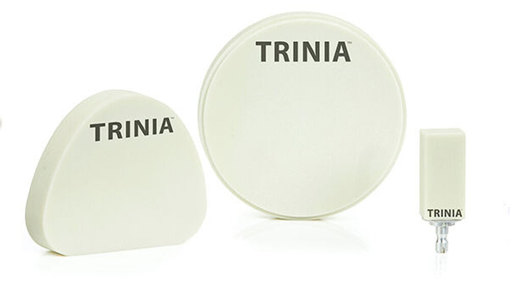 Die TRINIA-Fräsrohlinge sind in 98 Millimeter großen zirkularen Discs, 89 Millimeter großen D-förmigen Discs und 40 und 55 Millimeter großen Blöcken erhältlich. Sie entsprechen dem Industriestandard und sind in 15mm und 25mm Dicke verfügbar.