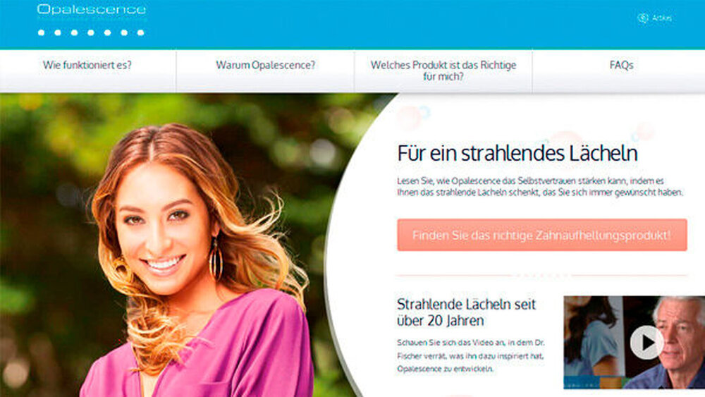 Alle Sachthemen werden mit vielen Fotos und Grafiken sowie Videos veranschaulicht. Diese Opalescence-Website (www.opalescence.com/de) macht Patienten neugierig – Suchende bekommen solide Informationen, Interessierte erfahren Details – und alle werden auf die zahnärztliche Praxis verwiesen, wo die Fachleute für Zahnaufhellung und schöne Zähne zu finden sind. So werden neue Patientenkreise angesprochen und für Zahnästhetik interessiert.