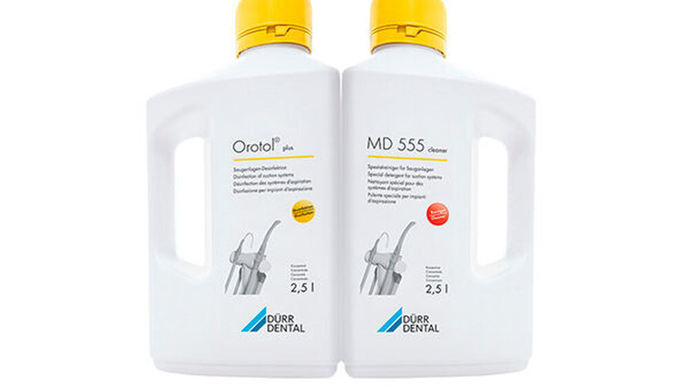Die Rede ist von dem seit Jahren zum Goldstandard der Sauganlagendesinfektion gehörenden Orotol plus und dem ebenso bewährten Spezialreiniger MD 555 cleaner.