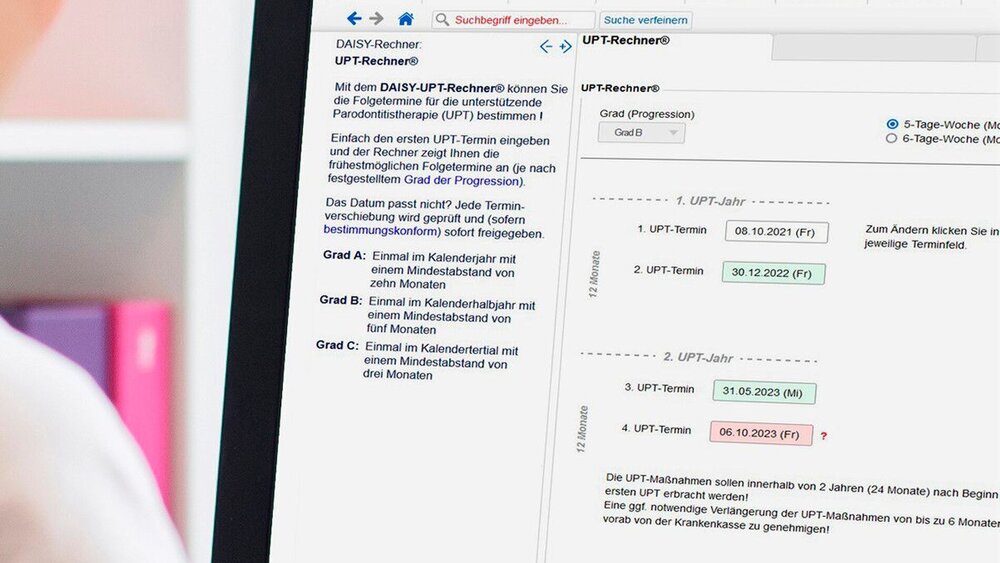 Die Abrechnungsbestimmungen der Bema-Nummern UPTa bis UPTg wurden in den DAISY-UPT-Rechner integriert. Neu ist neben der Ergänzung der Abrechnung und Prüfung von Terminverschiebungen auch die Prüfung von kompletten Terminausfällen, wenn beispielsweise bei Grad B der zweite UPT-Termin innerhalb der vorgegebenen Frequenz nicht stattfinden konnte. „Das ist eine Zusatzleistung, die bislang kein anderer Software-Anbieter hat – mit dem Ergebnis, dass der Anwender mithilfe des optimierten UPT-Rechners noch einfacher und sicherer durch den PAR-Dschungel geführt wird – quasi fehlerfrei und sorgenlos!“, zeigt sich die geschäftsführende Gesellschafterin Sylvia Wuttig durchaus stolz auf die letzten Weiterentwicklungen.