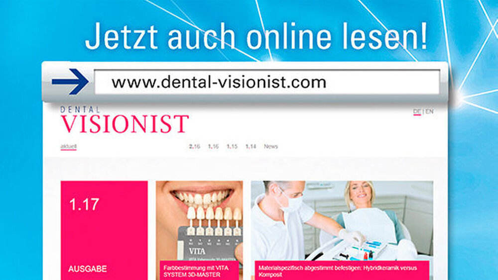 Schon seit vier Jahren informiert das Magazin in kompakter Form über Neuigkeiten und Trends aus Wissenschaft und Praxis. Hier bekommen die Leser neue fachliche Anregungen und wissenschaftliche Fakten, um als Praktiker wirtschaftlich und hochästhetisch versorgen zu können. Das Themenspektrum reicht von der präzisen Zahnfarbbestimmung und effizienten CAD/CAM-Fertigung über Tipps und Tricks in der Kronen- und Brückentechnik bis hin zur Totalprothetik und Implantologie. Dental Visionist bringt auf den aktuellen Stand über neue Technologien und Materialgenerationen. Internationalen Experten und Wissenschaftlern inspirieren den Leser und helfen dabei, neue Ideen zu gewinnen.