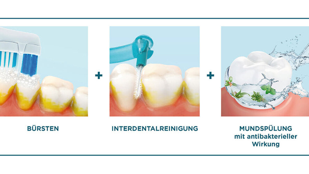 Als effiziente häusliche Strategie für den Erhalt der Mundgesundheit hat sich die 3-fach-Prophylaxe bewährt, die auch der Empfehlung der S3-Leitlinie zum „Häuslichen chemischen Biofilmmanagement in der Prävention und Therapie der Gingivitis“3 folgt: Hierbei wird die 2x tägliche mechanische Zahnreinigung bestehend aus Zähneputzen und Interdentalpflege mithilfe von Interdentalbürste oder Zahnseide durch die Anwendung einer Mundspülung mit antibakterieller Wirkung ergänzt.