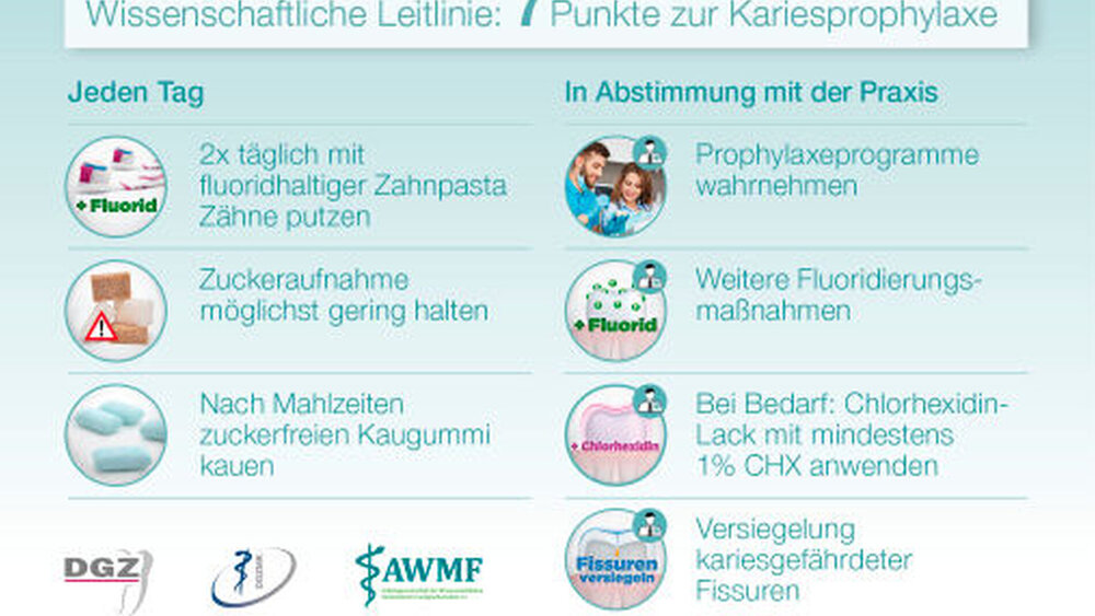 Was mit einer wissenschaftlichen Stellungnahme der Deutschen Gesellschaft für Zahnerhaltung (DGZ) im Oktober 2013 begann, mündete drei Jahre später in die erste umfassende wissenschaftliche Leitlinie zur Kariesprophylaxe bei bleibenden Zähnen. Unter Federführung der Deutschen Gesellschaft für Zahnerhaltung (DGZ) sowie der Deutschen Gesellschaft für Zahn-, Mund- und Kieferheilkunde (DGZMK) konsentierten insgesamt 14 Fachgesellschaften sieben grundlegende Empfehlungen1zur Kariesprophylaxe bei bleibenden Zähnen. Drei der sieben Empfehlungen setzen die Patienten selbst um. Idealerweise werden diese von Kindesbeinen an in der täglichen Zahnpflegeroutine verankert. Dazu zählen mindestens zweimal tägliches Zähneputzen mit fluoridhaltiger Zahnpasta, möglichst geringer Zuckerkonsum und Kaugummikauen zur Speichelstimulation nach Mahlzeiten. Die vier weiteren der sieben Empfehlungen erfolgen individuell und direkt in der Zahnarztpraxis oder in enger Abstimmung mit ihr (s. Grafik).