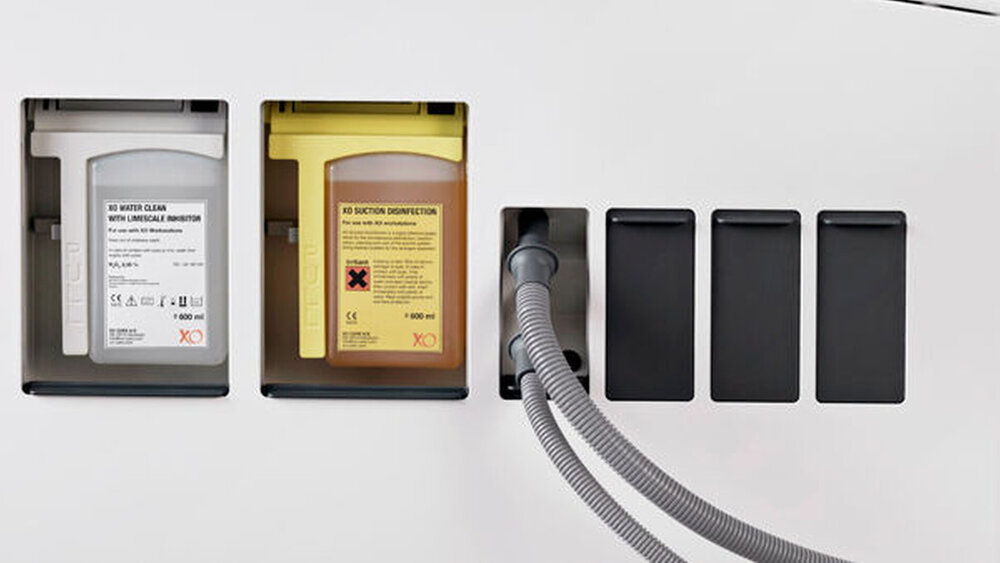 Auch das Wasser in den Behandlungseinheiten muss bestimmte hygienische Anforderungen erfüllen. Die Kommission für Krankenhaushygiene und Infektionsprävention beim Robert Koch-Institut (KRINKO) empfiehlt in ihren Leitlinien die Verwendung einer Behandlungseinheit mit einem Betriebswasser-desinfektionssystem2. Mit dem XO Suction Disinfection sind Zahnärzte auf der sicheren Seite, denn damit werden das Absaugsystem und die Schläuche der Einheit kontinuierlich desinfiziert. Darüber hinaus entkeimt der XO Water Clean mit Anti-Kalk-Zusatz das Wasser, das für die Behandlung verwendet wird und schützt so das Wassersystem der Einheit vor der Bildung von Biofilm. Eine weitere Gefahr für die wasserführenden Systeme der Einheit stellt die retrograde Kontamination über die Mundflora der Patienten dar. Die XO 4 Einheiten sind mit dem XO Instant View ausgestattet - einem leistungsstarken Chip-Blow, der den Rücklauf von Flüssigkeiten in das Wassersystem der Einheit verhindert. Vor Kreuzkontaminierung schützt auch die Bedienung der Einheit mit dem Fußanlasser. Dadurch kommt der Zahnarzt während der Behandlung nicht in Berührung mit Schaltern oder Displays und kann sich außerdem voll auf die Mundhöhle des Patienten konzentrieren.