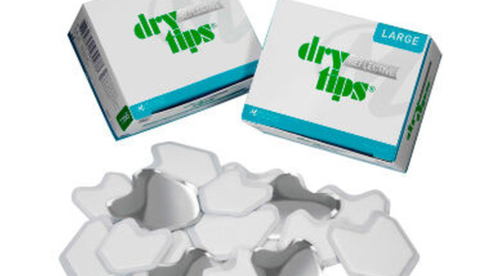 Die Pads sind in zwei Größen und seit neuestem auch mit reflektierender Beschichtung erhältlich. Reflective DryTips sind einseitig mit silberner Folie ausgestattet, die zur Zahnreihe ausgerichtet wird. So entsteht deutlich mehr Helligkeit und eine bessere Sicht, etwa für die Arbeit mit dem Mikroskop.