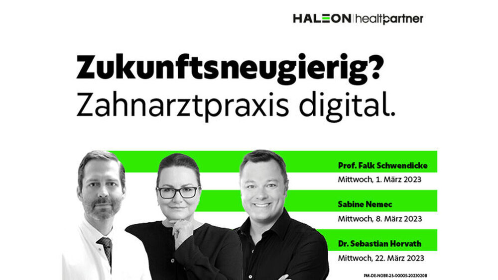 Es erwartet Sie wissenswertes zu Themen wie Künstlicher Intelligenz in der Zahnmedizin, Social Media als wertvolles Kommunikationstool und digitalen Arbeitsabläufen. Lernen auch Sie die neuesten Erkenntnisse und Empfehlungen ausgewiesener Expert:innen kennen. Die Webinar-Serie Zahnarztpraxis digital wird Ihnen präsentiert von Haleon HealthPartner und ist mit jeweils 1 CME-Punkt pro Webinar akkreditiert, sowie ein Jahr auf Abruf verfügbar nach Live-Ausstrahlung.
