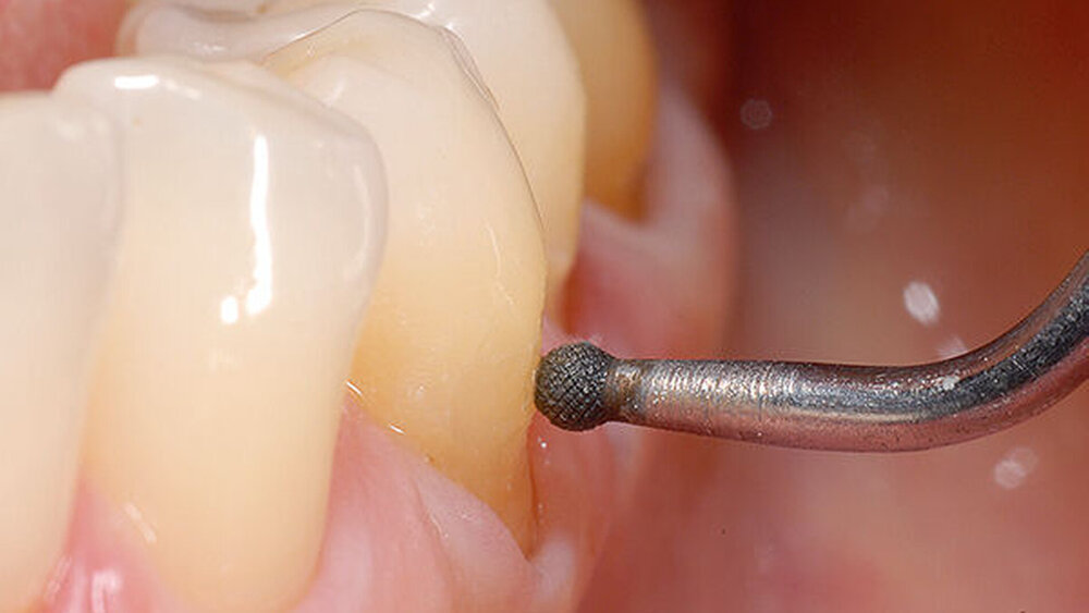 Wegen des geringeren Risikos einer Schädigung der verbliebenen Zahnsubstanz wurde für die Entfernung der alten Füllung und für die Kavitätenpräparation ein Ultraschallinstrument gewählt (Abb. 2 bis 4).