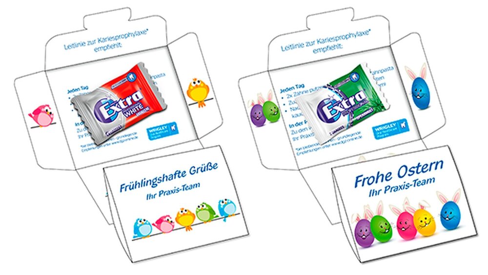 Gründliches Zähneputzen am Morgen und Abend ist die Grundlage der täglichen Routine für gesunde Zähne, wie sie die Kariesprophylaxe-Leitlinie der Deutschen Gesellschaft für Zahnerhaltung (DGZ) empfiehlt.[1] Zahnarzt- und Arztpraxen können ihren Patientinnen und Patienten ab März zum Frühlingsbeginn und zur Osterzeit nach der Behandlung ein kleines Lächeln ins Gesicht zaubern und gleichzeitig Lust auf Prophylaxe machen – mit Wrigley’s Extra-Kaugummi mit passend gestalteten Envelopes. Mit den drei Leitlinien-Tipps zur täglichen Kariesprophylaxe auf der Innenseite – Zähne putzen, wenig Zucker, Kaugummi kauen – erinnern die Envelopes daran, beim Genuss auch an die Zähne zu denken.