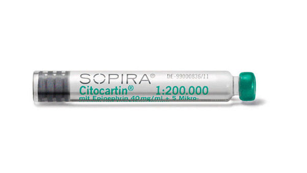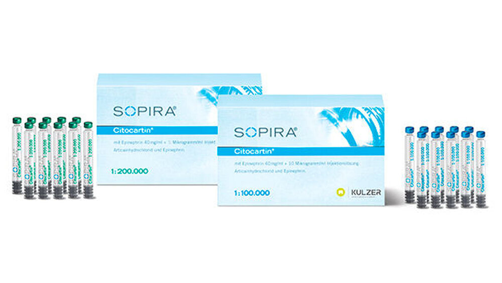 Citocartin von Kulzer enthält 40 mg Articain und bietet für jede Indikation das passende Lokalanästhetikum mit unterschiedlich konzentrierten Adrenalinzusätzen: 1:100.000 für eine Wirkdauer von ca. 75 Minuten sowie im Verhältnis 1:200.000 für eine Wirkdauer von ca. 45 Minuten. Die Wirkung tritt jeweils nach ein bis drei Minuten ein. Das Präparat ist zudem frei von Parabenen. Die 1,7 ml Citocartin Zylinderampullen sind kompatibel mit allen gängigen Dentalspritzen und bilden zusammen mit dem größten Sortiment an Dentalkanülen SOPIRA Carpule Nadeln, der SOPIRA Citoject (ILA) und der SOPIRA Ject Spritze eine perfekte Komplettlösung aus einer Hand.