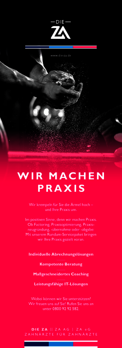 Seit mehr als 30 Jahren macht sich die ZA als von Zahnärzten für Zahnärzte geführtes Abrechnungsunternehmen für die Interessen der unabhängigen Zahnärzteschaft stark. Unter dem Motto „Weil jede Praxis zählt“ steht sie Zahnärzten, Kieferorthopäden und MKG-Chirurgen mit einem breiten Servicespektrum rund um die Abrechnung und die gesamte Praxisentwicklung zur Seite. Im Zentrum stehen dabei leistungsstarke Factoring-Produkte, die durch umfassende Dienstleistungen wie individuelle Abrechnungslösungen, maßgeschneiderte Coachings oder Unterstützung bei der Praxisgründung, -übernahme und -abgabe ergänzt werden. So hält die ZA nicht nur den Zahnmedizinern, sondern dem gesamten Praxisteam den Rücken frei – damit Praxisprozesse ohne Störung laufen und sie sich ganz auf ihre Patienten konzentrieren können. Ein Großteil der Gewinne fließt dabei im Sinne des Genossenschaftsprinzips in ausgeklügelte Projekte für Kunden und die gesamte Zahnärzteschaft zurück.