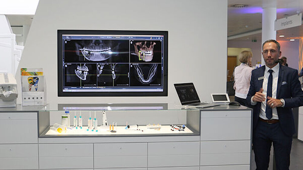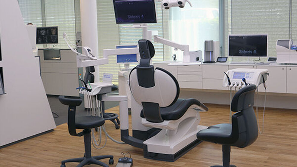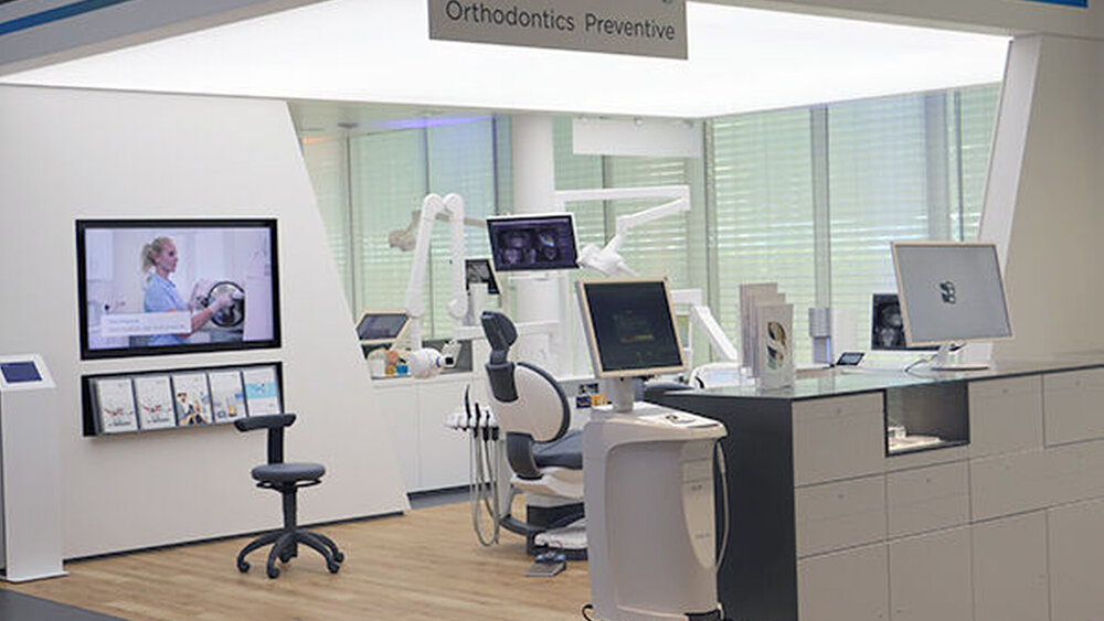 Dafür wurden im völlig neu konzipierten Showroom Sektionen eingerichtet, die jeweils für einen bestimmten Produktbereich stehen. Darin finden sich auch die insgesamt zehn Geschäftsbereiche von Dentsply Sirona wieder, welche den Charakter des Unternehmens als Dental Solutions Company widerspiegeln. Hier können die Produkte am Modell eingesetzt werden. Die dort aufgestellten Behandlungseinheiten sind digital mit der Sektion Röntgen und Labor verbunden, so dass sich digitale Arbeitsabläufe optimal demonstrieren lassen. Das Mobiliar ist flexibel gestaltet, so dass es an neue Produkte und Lösungen jederzeit angepasst werden kann.