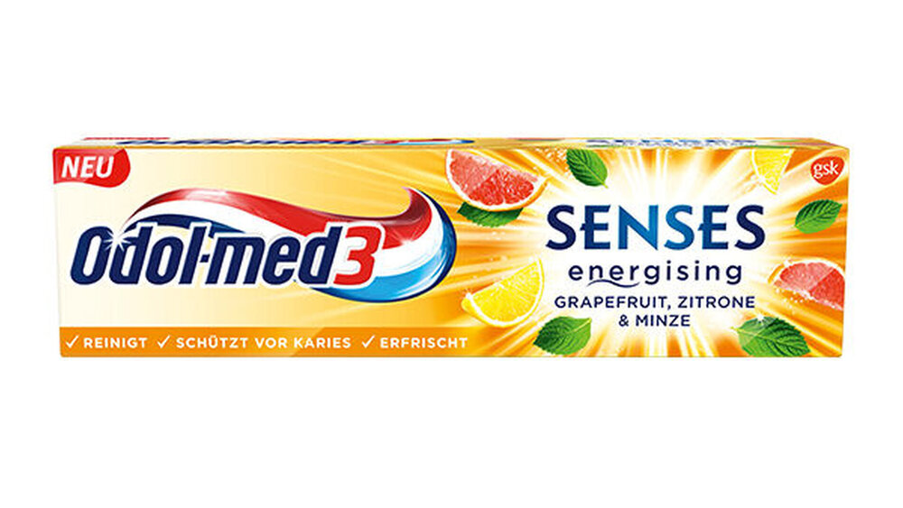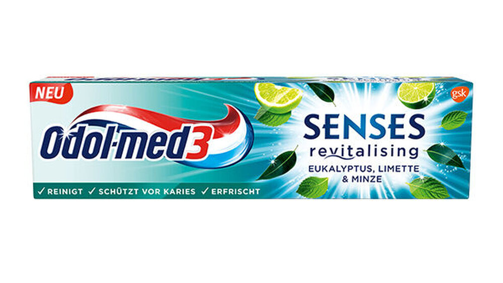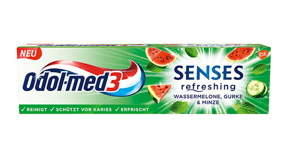 Mit der neuen Odol-med3 SENSES Zahncreme wird die Mundhygiene nun zu einem intensiven Erlebnis für die Sinne: Die innovative Zahnpasta kombiniert in drei Geschmacksvarianten beliebte Fruchtaromen mit Minze: Revitalising Eukalyptus, Limette & Minze; Energising Grapefruit, Zitrone & Minze und Refreshing Wassermelone, Gurke & Minze. Sie bietet den bewährten Rundumschutz – sie reinigt, beugt Karies vor und härtet den Zahnschmelz. Die besondere Kombination von Frucht und Minze sorgt zudem für ein frisches und sauberes Mundgefühl. Odol-med3 SENSES ist seit Februar 2020 erhältlich (UVP: 1,99 €