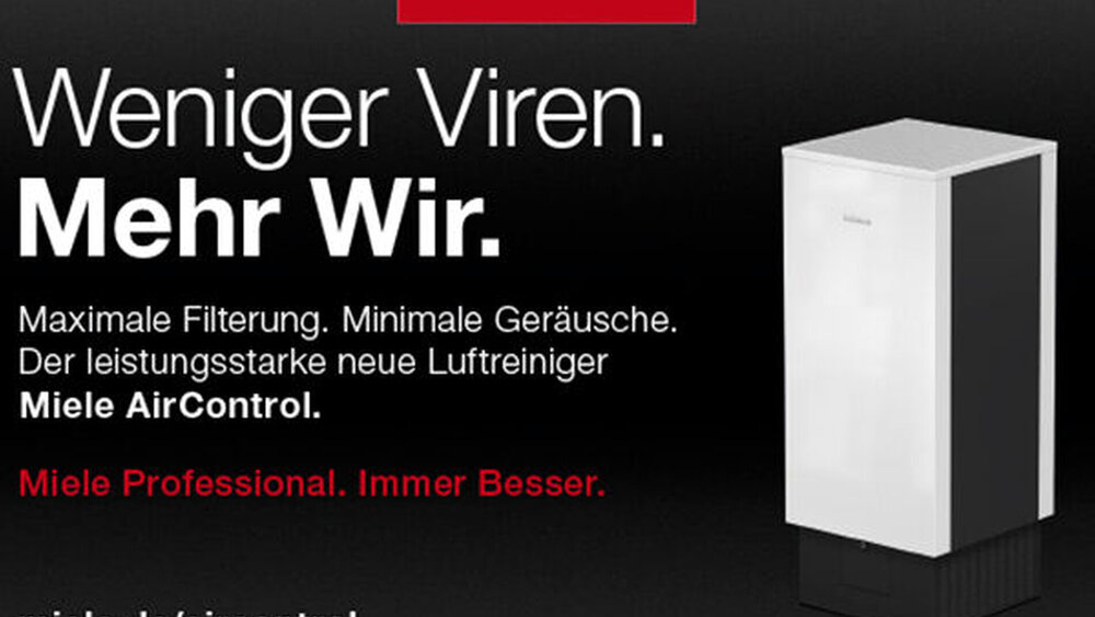 "Weniger Viren. Mehr Wir" – das ist das Motto der neuen mobilen Luftreiniger mit HEPA H14-Filter von Miele. Bis zu sechsmal pro Stunde wird die Luft von ihnen umgewälzt und gefiltert.